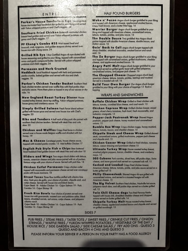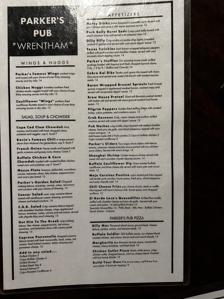 Introducing the menu at Parkers Pub, located in Wrentham, MA, brings a delightful array of dishes perfect for casual dining with friends. From the Brew House Pretzel served with house queso and stone ground mustard to the Cobra Kai Ribs in Asian BBQ sauce, the appetizers set the stage for a flavorful experience. The Chicken Nuggs and Pub Wings are must-tries for enthusiasts of crispy, saucy delights. For lighter options, the Cape Cod Clam Chowder and Classic Caesar Salad offer classic comfort. Parkers Pub has garnered praise for its fantastic wings, attentive service, and lively atmosphere, making it a go-to spot for local residents and visitors alike. Whether you're craving bar bites or heartier fare, Parkers Pub delivers a satisfying dining experience worth revisiting.